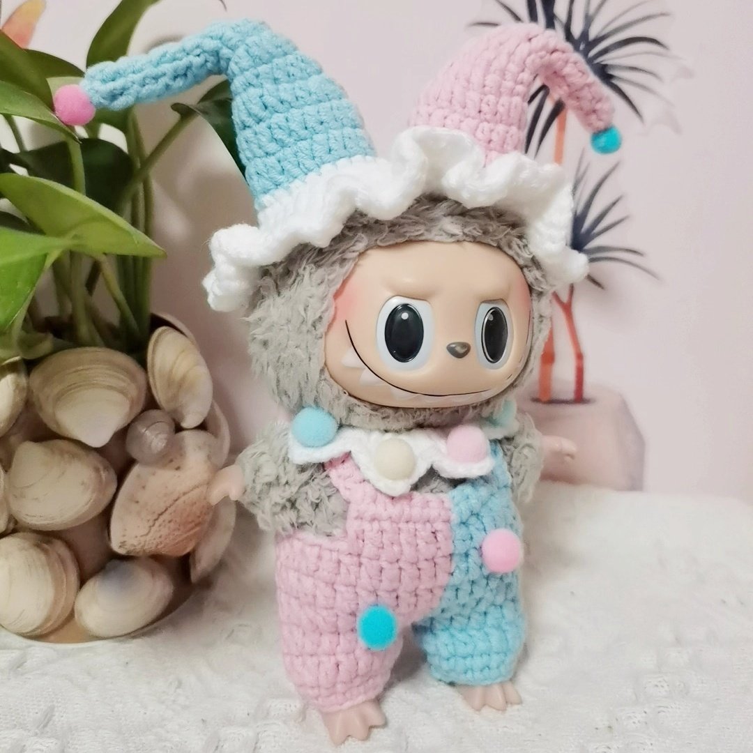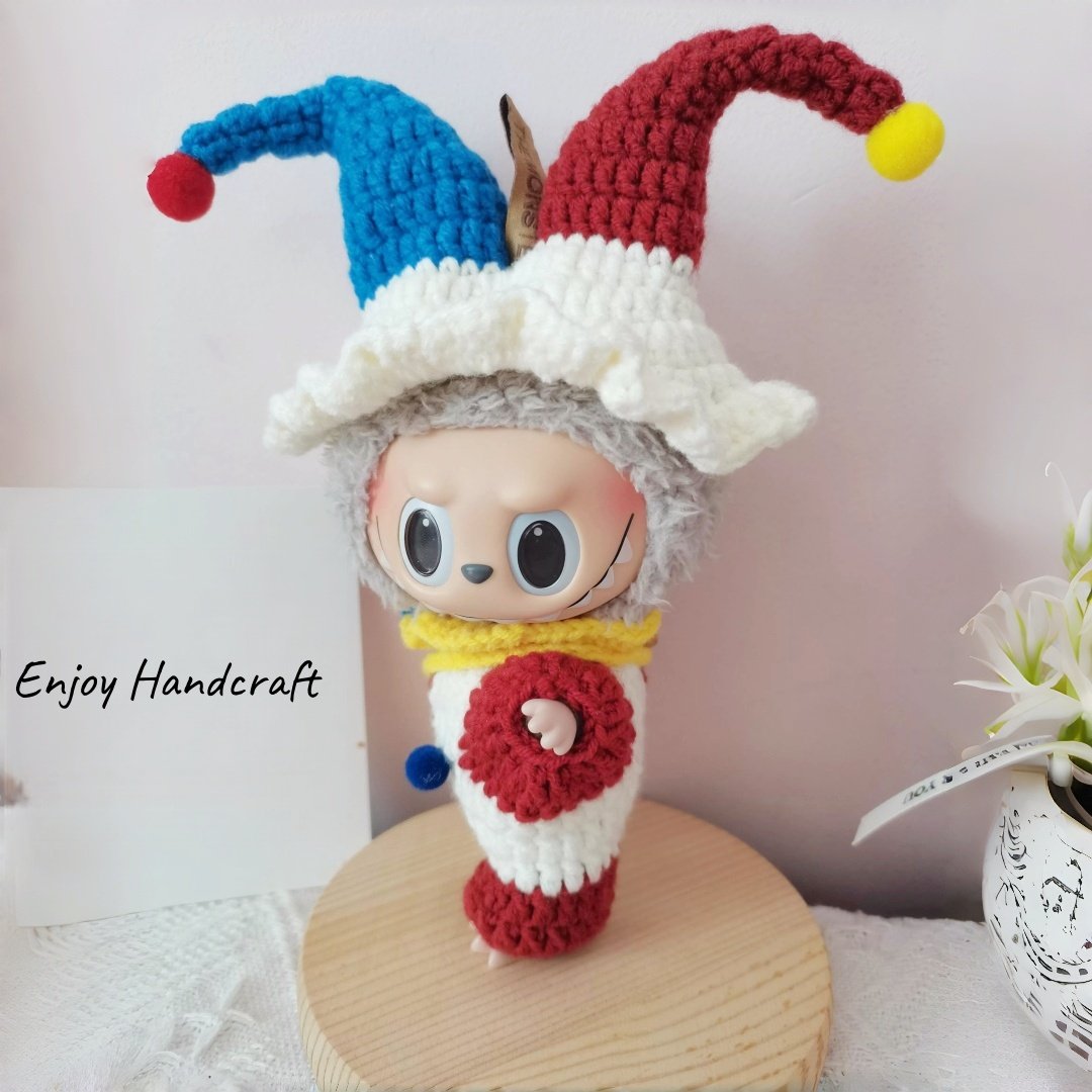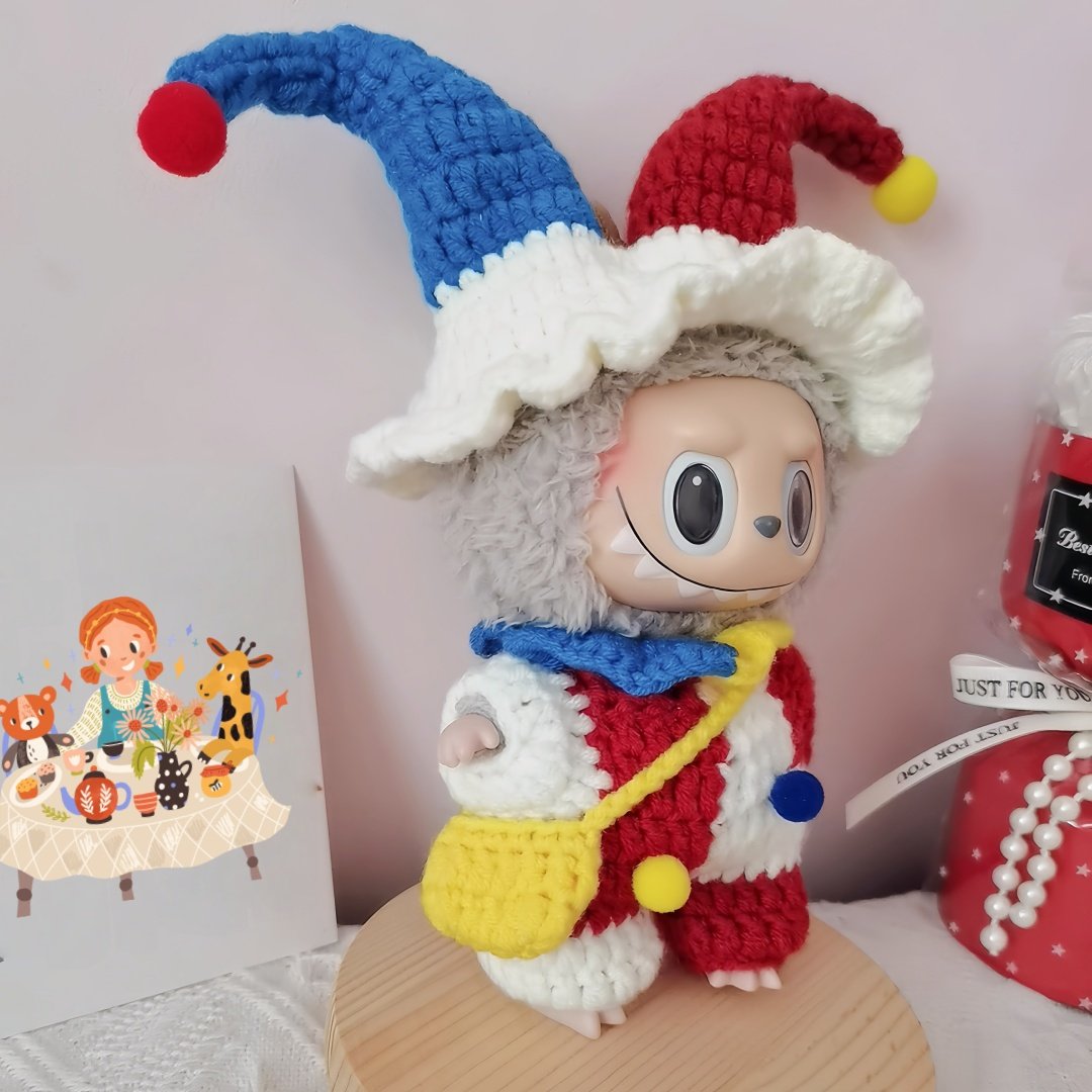 Labubu Clothes, Handmade Crochet Labubu Cloth Set, Halloween Clown Outfits for 17cm Labubu, 4pcs overall set